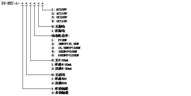 舉例如下:單路接觸器,2路通訊接口,1路4-20mA輸出接口,電機額定功率37KW,無漏電檢測,裝置電源為AC220V,則型號表示為:KW-MMI-A-121401。