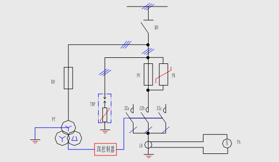 正常運行時微機控制器不斷檢測PT提供的電壓信號,一旦系統(tǒng)發(fā)生單相弧光接地時,真空接觸器快速動作,將不穩(wěn)定的弧光接地轉化為穩(wěn)定的金屬性接地。裝置輸出開關量接點信號,同時可通過RS485(或RS232)接口與微機監(jiān)控系統(tǒng)實現(xiàn)數據遠傳。
